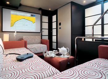Rentoutumisen ja hyvän ruoan lisäksi Azimut-risteilyyn voi yhdistää neuvottelut tärkeimpien yhteistyökumppanien kanssa. Aluksen tätä tarkoitusta varten suunnitellussa mediahuoneessa on mm. suuri plasma TV esityksiä varten.
